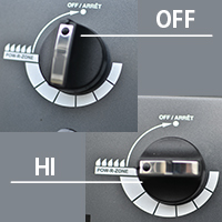 | ・パネル正面の火力調整つまみ(コントロールノブ)を すべて”OFF ”(閉鎖)位置に合わせ、その後LPガス容器の元栓を開けます。 |
