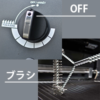 | ・調理終了後、コントロールノブを”HIGH”で約5~10分間空焼します。 グリッドや放熱板に付着していた食材の残りや油脂分などを焼き切るためです。 ・消火はガスの元栓から閉じます。 その後、ノブを”OFF”位置に戻したら消火は完了です。 ・消火後は、グリッドが熱くなっているうちに長い柄付の真鍮ブラシで、 グリッドに付着している焼き切られた食材クズなどを掻き落とします。 この時、火傷しないように厚手軍手などを必ず 着用して下さい。 鋳鉄製グリッドは全面(表・裏)に食用オイルを軽く塗布またはスプレーして 下さい。 これで十分で、毎回の洗浄は必要ありません。 |